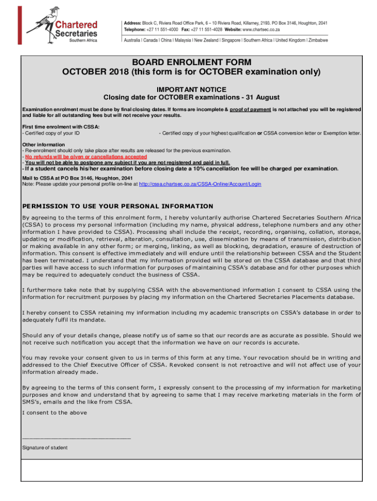 BOARD Enrollment FORM OCTOBER 2018 (this form is for OCTOBER examination only) IMPORTANT NOTICE Closing date for OCTOBER examinations 31 August Examination enrollment must be done by final closing