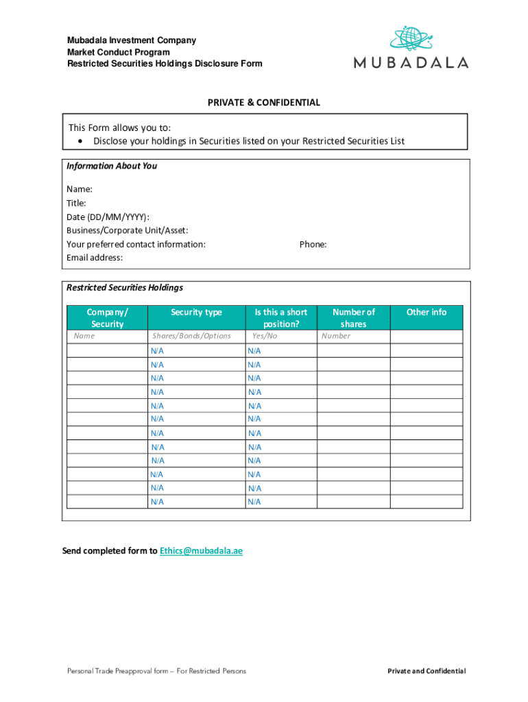 Metadata Investment Company Market Conduct Program Restricted Securities Holdings Disclosure FormPRIVATE & CONFIDENTIAL This Form allows you to: Disclose your holdings in Securities listed on your