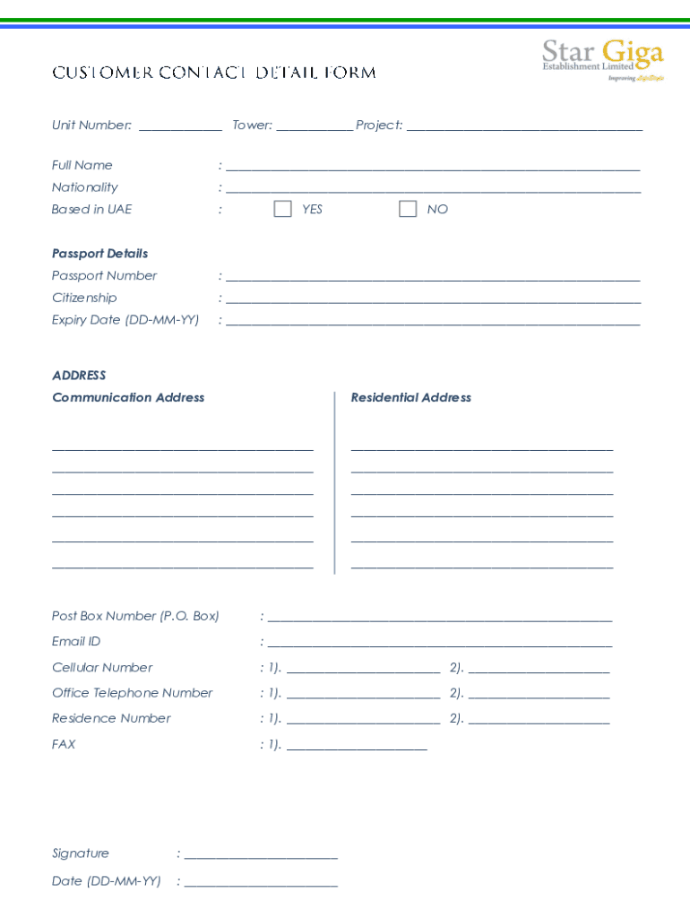 Unit Number: Tower: Project: Full Name: Nationality: Based in the UAE:YESNOPassport Details Passport Number: Citizenship: Expiry Date (DUMMY): ADDRESS Communication AddressResidential Address Post