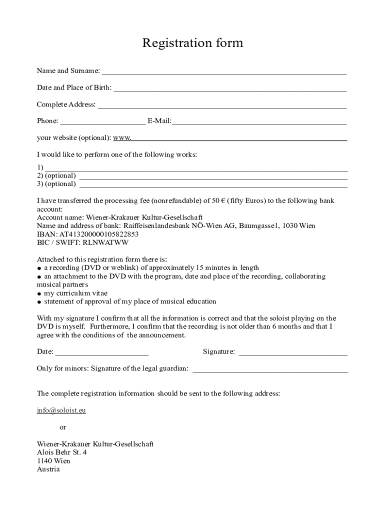 Registration form Name and Surname: Date and Place of Birth: Complete Address: Phone: Email: your website (optional): WWW. I would like to perform one of the following works: 1) 2) (optional) 3) (optional)