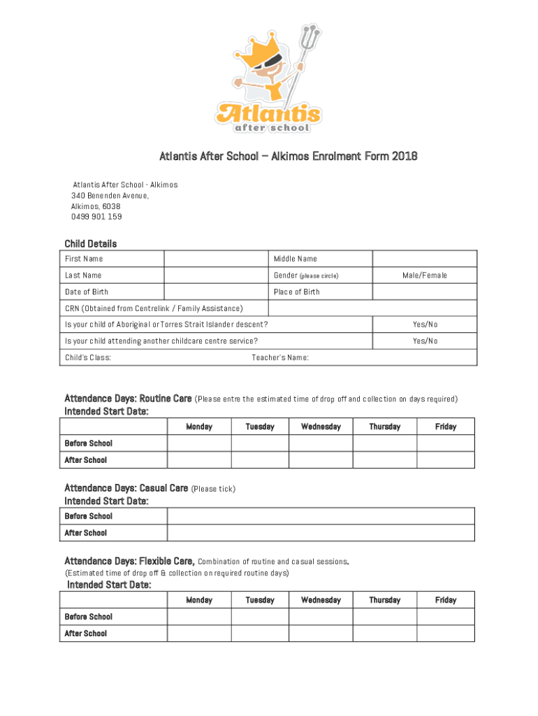 Atlantis After School Eskimos Enrollment Form 2018 Atlantis After School Eskimos 340 Benenson Avenue, Eskimos, 6038 0499 901 159Child Details First NameMiddle Nameless Nameserver (please circle)Date