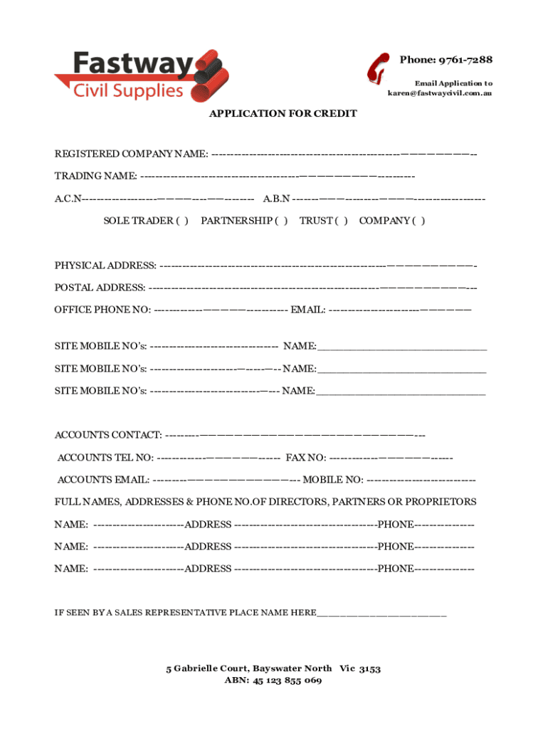 Phone: 97617288 Email Application to Karen fastwaycivil.com.application FOR CREDITREGISTERED COMPANY NAME: TRADING NAME: A.C.N A.B.N SOLE TRADER ()PARTNERSHIP ()TRUST ()COMPANY ()PHYSICAL ADDRESS: