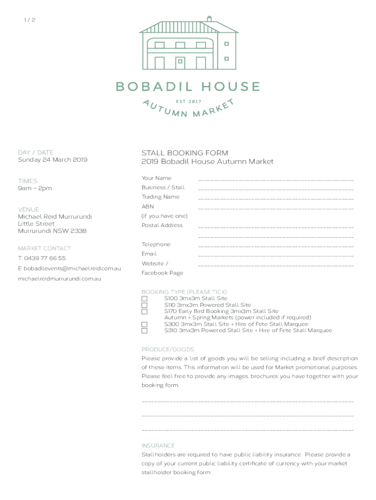 1/2DAY / DATE Sunday 24 March 2019STALL BOOKING FORM 2019 Bobtail House Autumn MarketTIMES 9am 2pmYour Name Business / Stall Trading Name ABN VENUE Michael Reid Murrurundi Little Street Murrurundi