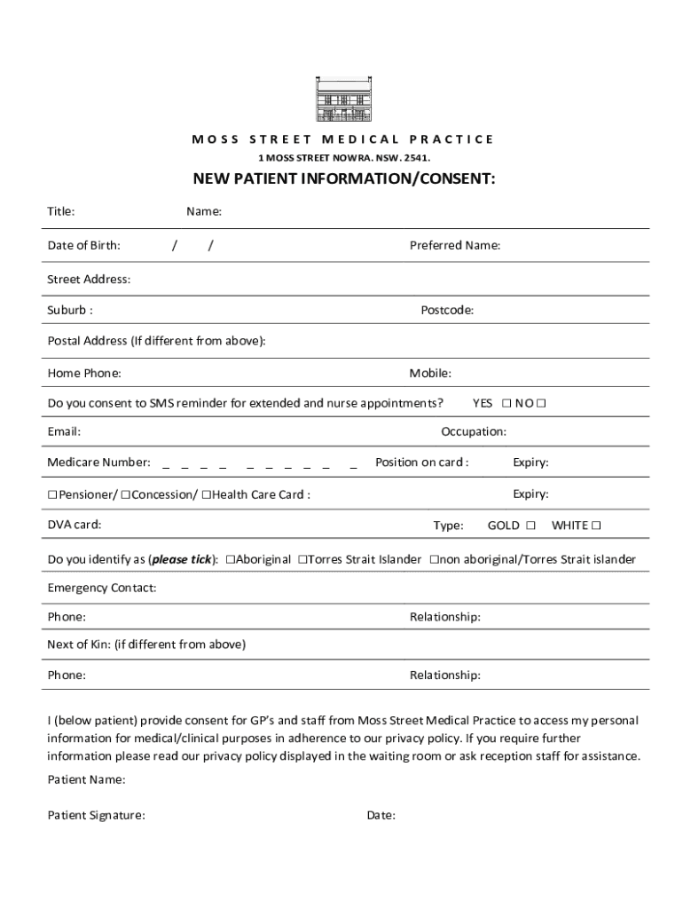 MOSS STREET MEDICAL PRACTICE 1 MOSS STREET NORA. NSW. 2541.NEW PATIENT INFORMATION/CONSENT: Title: Date of Birth:Name: //Preferred Name:Street Address: Suburb :Postcode:Postal Address (If different