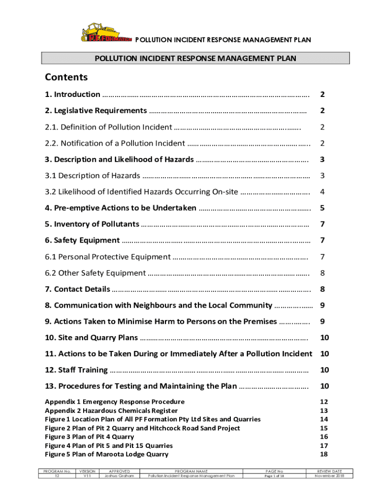 POLLUTION INCIDENT RESPONSE MANAGEMENT PLANPOLLUTION INCIDENT RESPONSE MANAGEMENT Malcontents 1. Introduction .22. Legislative Requirements .22.1. Definition of Pollution Incident .22.2. Notification