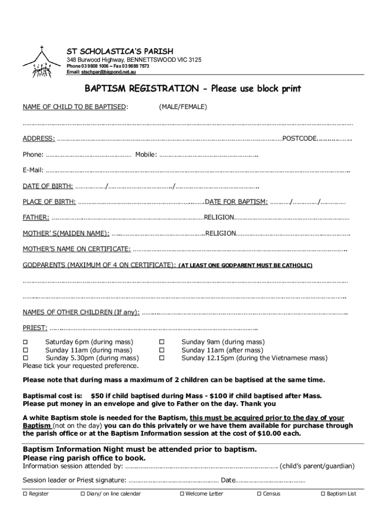 ST SCHOLASTIC PARISH 348 Bur wood Highway, BENNETTSWOOD VIC 3125 Phone 03 9808 1006 Fax 03 9888 7573 Email: stschpar big pond.net.baptism REGISTRATION Please use block print NAME OF CHILD TO BE Baptized:(MALE/FEMALE)