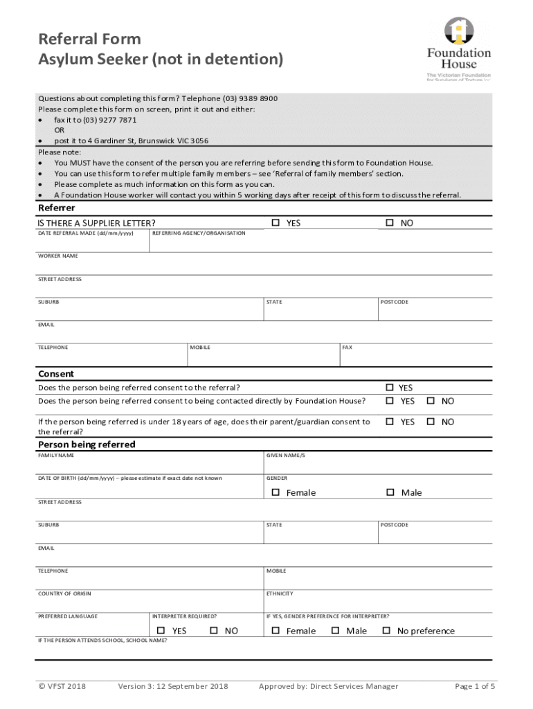 Referral Form Asylum Seeker (not in detention) Questions about completing this form? Telephone (03) 9389 8900 Please complete this form on screen, print it out and either: fax it to (03) 9277 7871