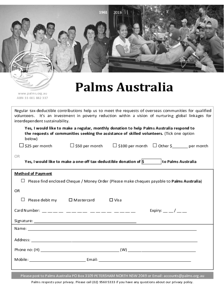 ABN 33 001 882 3372015Palms AustraliaRegular tax-deductible contributions help us to meet the requests of overseas communities for qualified