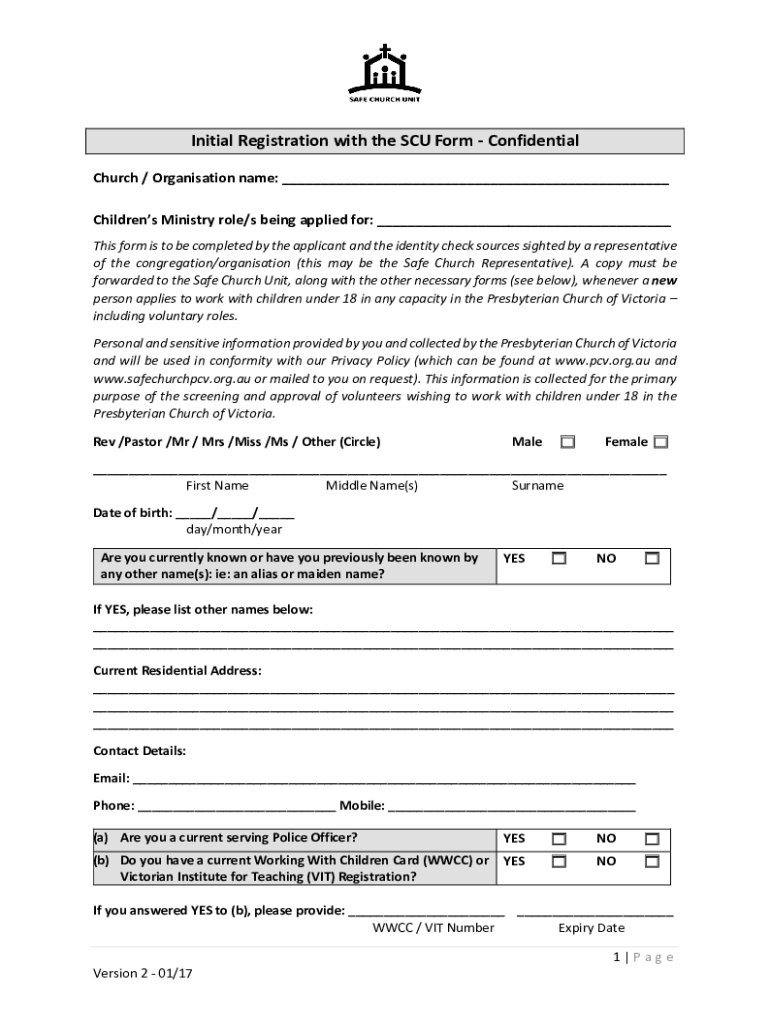 Initial Registration with the SCU Form Confidential Church / Organization name: Children's Ministry role/s being applied for: This form is to be completed by the applicant and the identity check sources