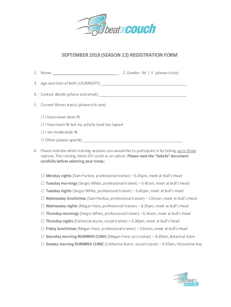 SEPTEMBER 2018 (SEASON 12) REGISTRATION FORM 1. Name: 2. Gender: M / F (please circle) 3. Age and Date of Birth (DD/MM/BY): 4. Contact details (phone and email): 5. Current fitness status (please