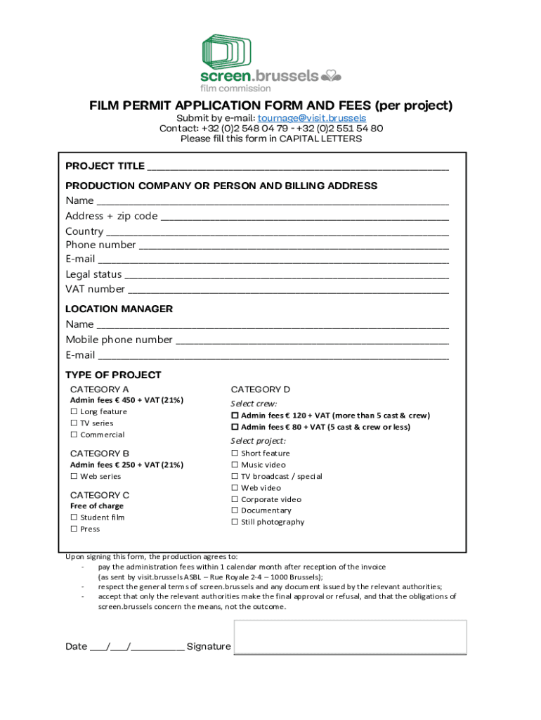 FILM PERMIT APPLICATION FORM AND FEES (per project) Submit by email: courage visit. Brussels Contact: +32 (0)2 548 04 79 +32 (0)2 551 54 80 Please fill this form in CAPITAL LETTERSPROJECT TITLE PRODUCTION