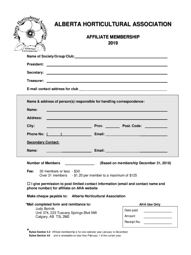ALBERTA HORTICULTURAL ASSOCIATION AFFILIATE MEMBERSHIP 2019 Name of Society/Group/Club: President: Secretary: Treasurer: Email contact address for club Name & address of person(s) responsible for