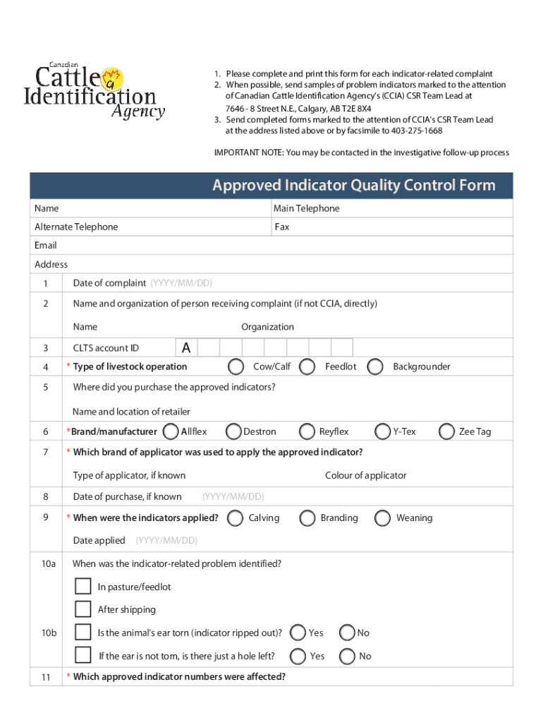1. Please complete and print this form for each indicator related complaint 2. When possible, send samples of problem indicators marked to the attention of Canadian Cattle Identification Agency's