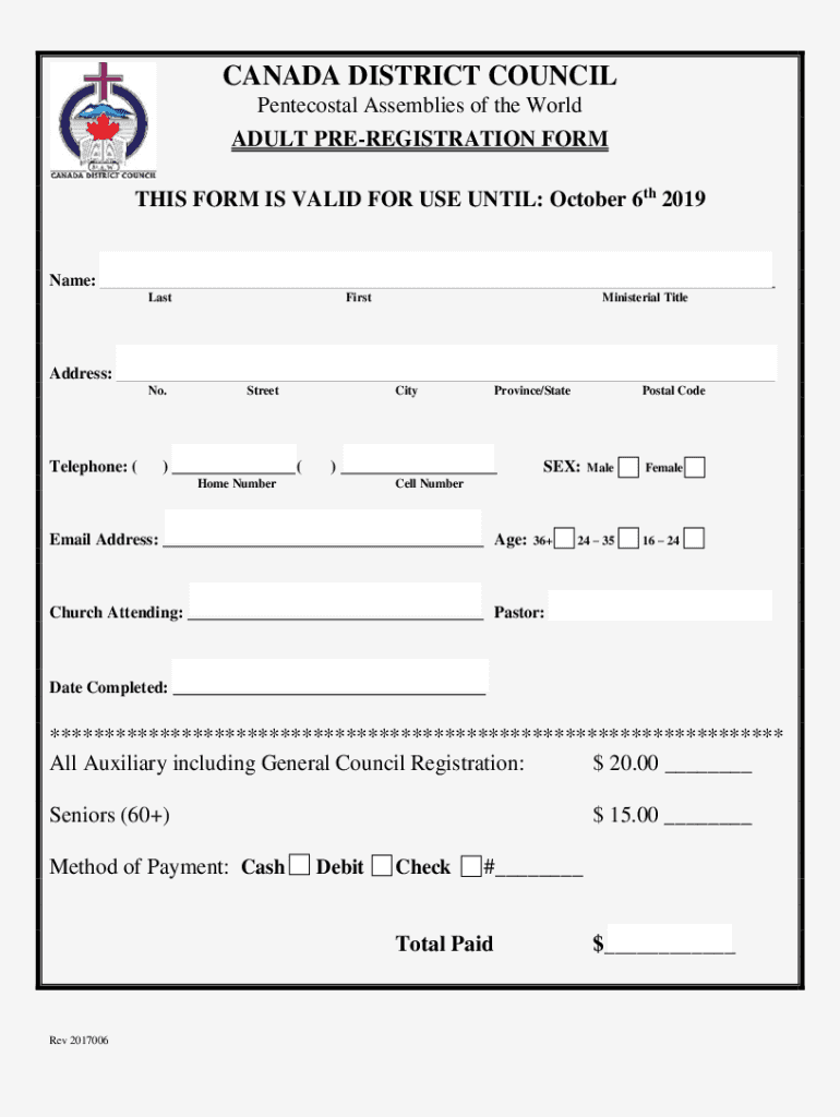 CANADA DISTRICT COUNCIL Pentecostal Assemblies of the World ADULT PREREGISTRATION FORM THIS FORM IS VALID FOR USE UNTIL: October 6th 2019Name: LastFirstMinisterial TitleAddress: No. Telephone: (Street)