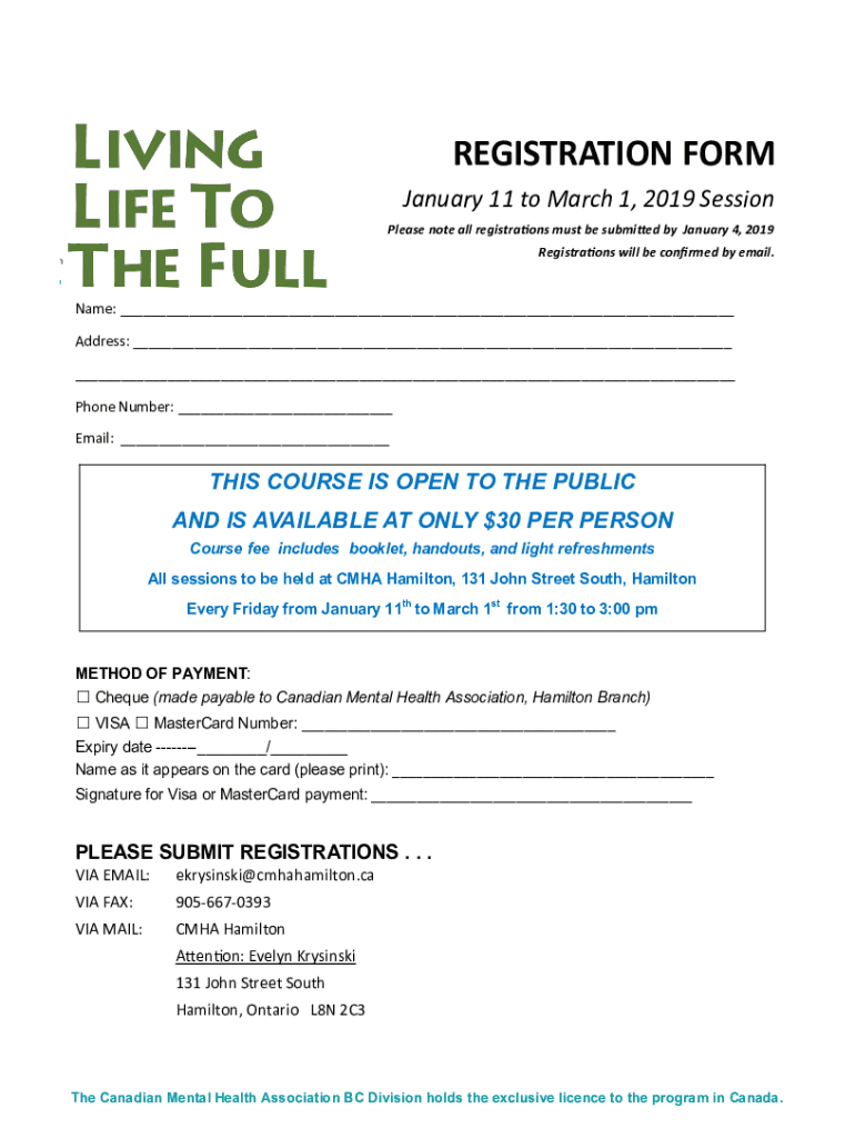 Get the free REGISTRATION FORM - CMHA Hamilton