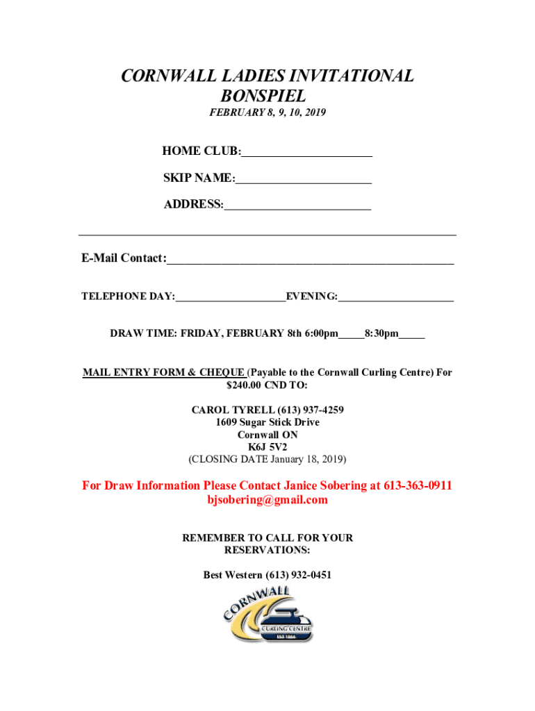 CORNWALL LADIES INVITATIONAL GOSPEL FEBRUARY 8, 9, 10, 2019HOME CLUB: SKIP NAME: ADDRESS: Email Contact: TELEPHONE DAY: EVENING: DRAW TIME: FRIDAY, FEBRUARY 8th 6:00pm 8:30pm MAIL ENTRY FORM & Check