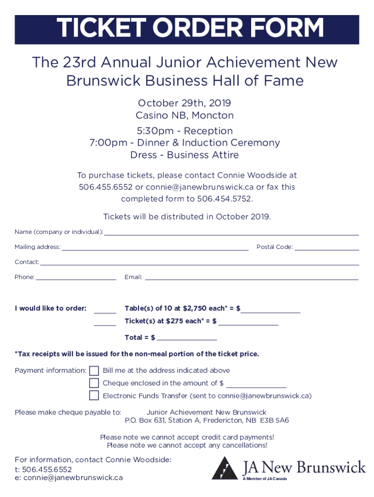 TICKET ORDER FORM The 23rd Annual Junior Achievement New Brunswick Business Hall of Fame October 29th, 2019 Casino NB, Moncton 5:30pm Reception 7:00pm Dinner & Induction Ceremony Dress Business Attire