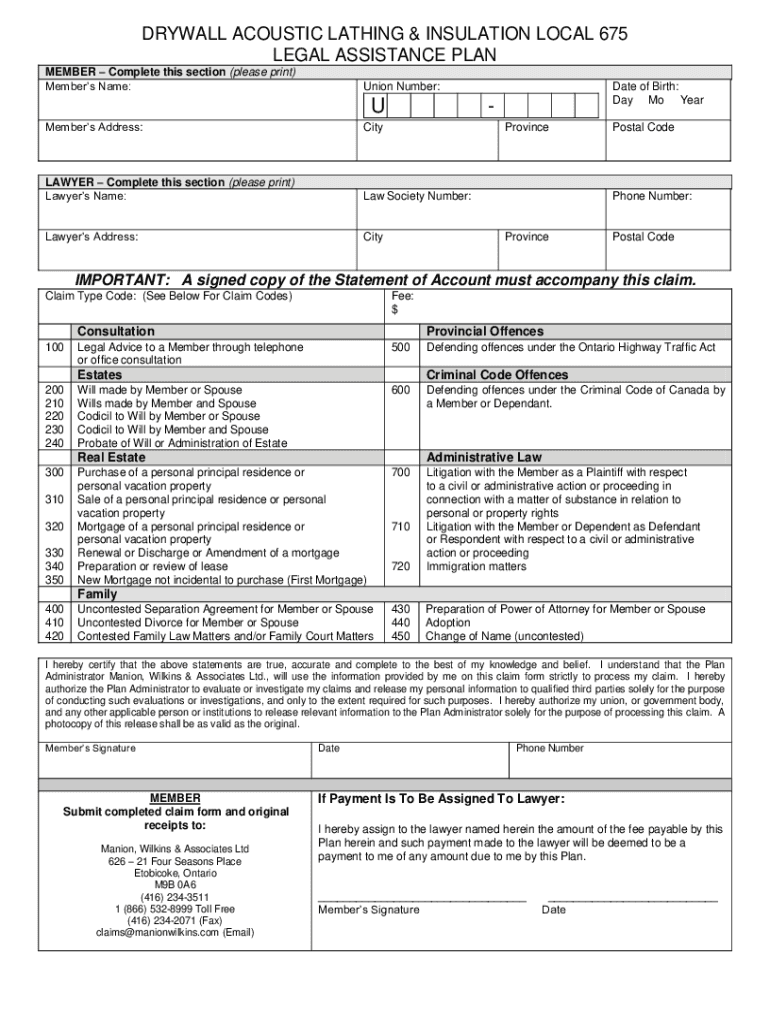 DRYWALL ACOUSTIC LATHING & INSULATION LOCAL 675 LEGAL ASSISTANCE PLAN MEMBER Complete this section (please print) Members Name:Union Number:Date of Birth: Day Mo Remembers Address:CityLAWYER Complete