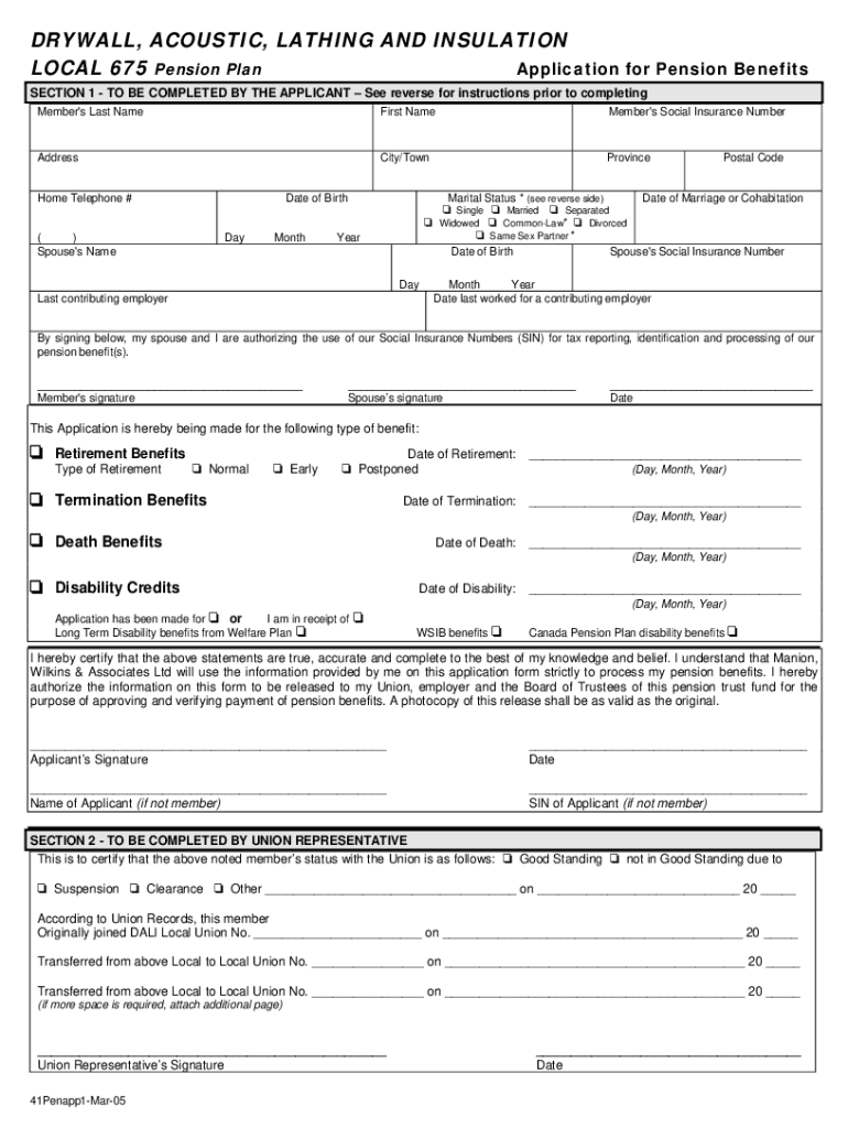 DRYWALL, ACOUSTIC, LATHING AND INSULATION Application for Pension Benefits LOCAL 675 Pension Plan SECTION 1 TO BE COMPLETED BY THE APPLICANT See reverse for instructions prior to completing Member's