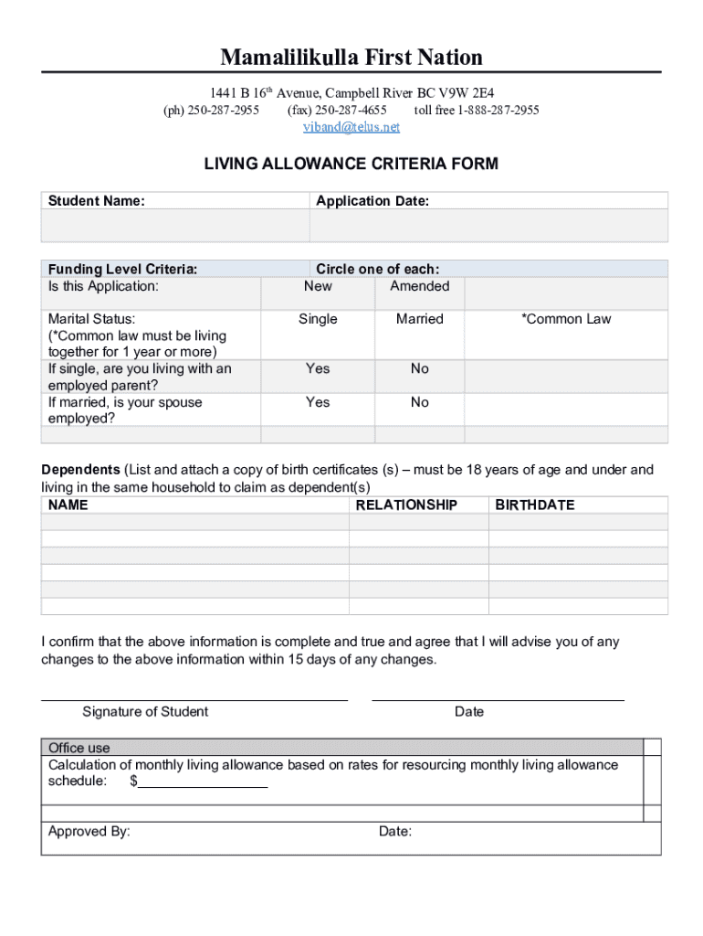 (pH) 2502872955(fax) 2502874655toll free 18882872955viband@telus.netLIVING ALLOWANCE CRITERIA FORM