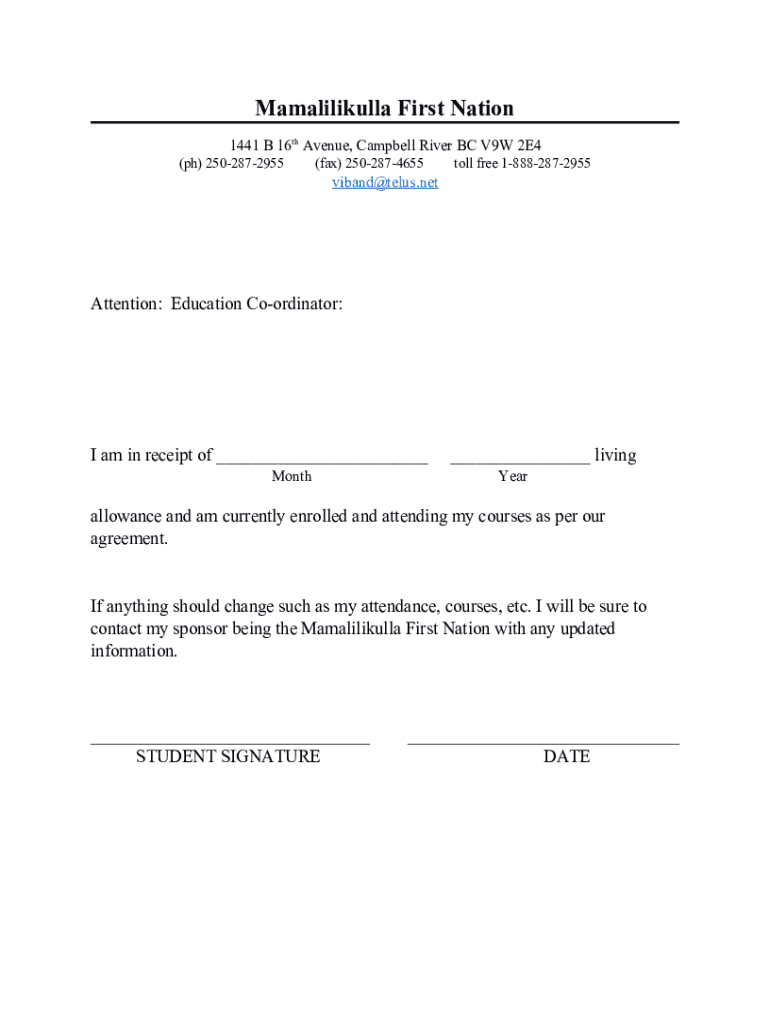 Mamalilikulla First Nation 1441 B 16th Avenue, Campbell River BC V9W 2E4 (pH) 2502872955(fax) 2502874655toll free 18882872955viband Telus.attention: Education Coordinator:I am in receipt of Month