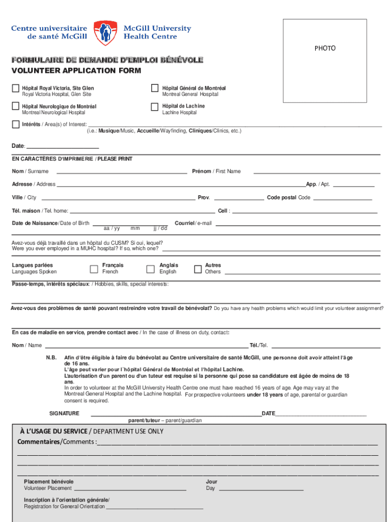 PHOTO FORMULA IRE DE DEMAND EMPLOY INVOLVE VOLUNTEER APPLICATION FORM Hp ital Royal Victoria, Site Glen Royal Victoria Hospital, Glen SiteHpital Gnarl de Montral Montreal General HospitalHpital Neurological