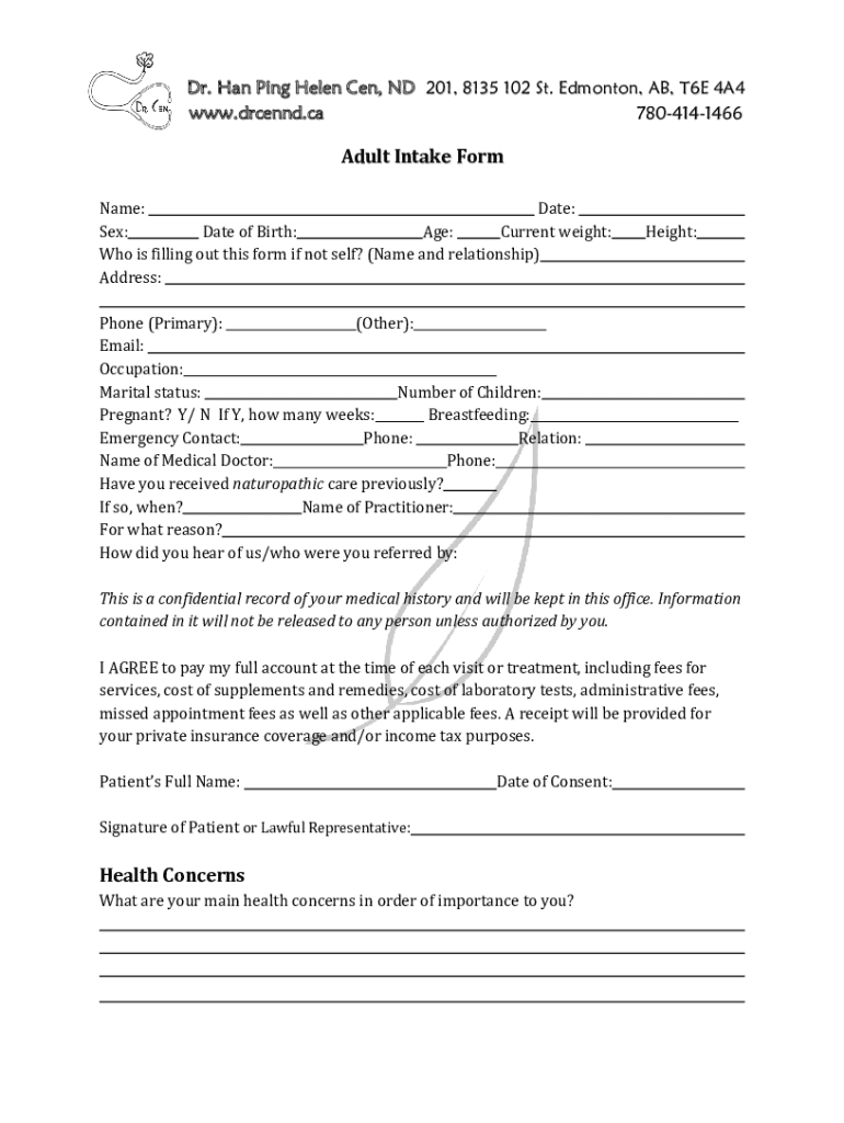 Dr. Han Ping Helen CEN, ND 201, 8135 102 St. Edmonton, AB, T6E 4A4 www.drcennd.ca 7804141466Adult Intake Form Name: Date: Sex: Date of Birth: Age: Current weight: Who is filling out this form if not