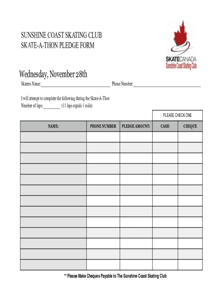 SUNSHINE COAST SKATING CLUB SATIATION PLEDGE FORM Thursday, December 14th 4:45pm6:00pm GACC Wednesday, November 28th Skaters Name: Phone Number: I will attempt to complete the following during the