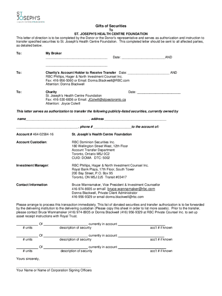 Gifts of Securities To ST. JOSEPH IS HEALTH Center FOUNDATION This letter of direction is to be completed by the Donor or the Donors representative and serves as authorization and instruction to transfer
