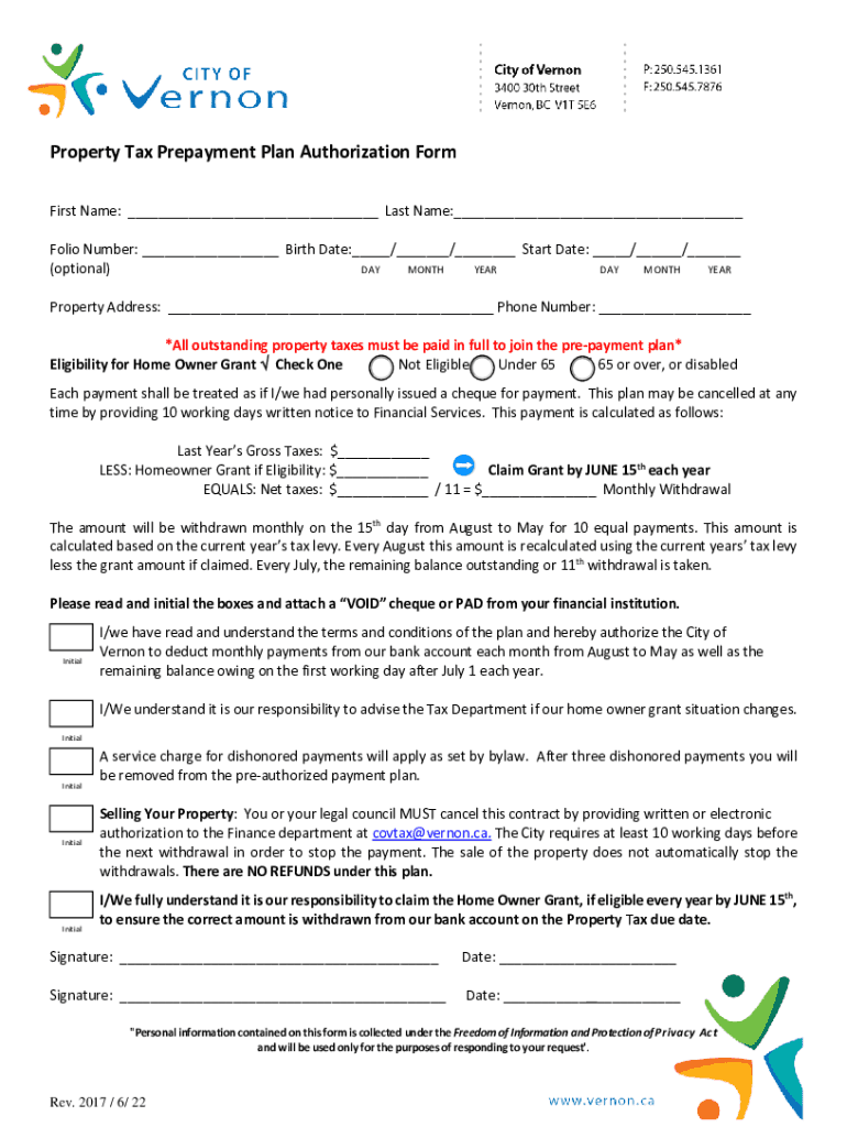 Get the free Tax Pre-Payment Plan Authorization Form - City of Vernon