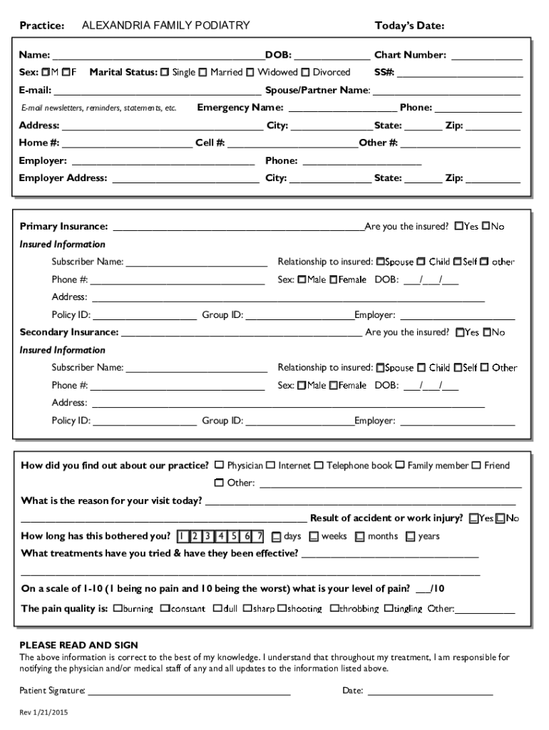 Practice:ALEXANDRIA FAMILY PODIATRYTodays Date:Name: DOB: Chart Number: Sex:Marital Status:ingleMarriedWidowedDivorcedSS#: Email: Spouse/Partner Name: Email newsletters, reminders, statements, etc.