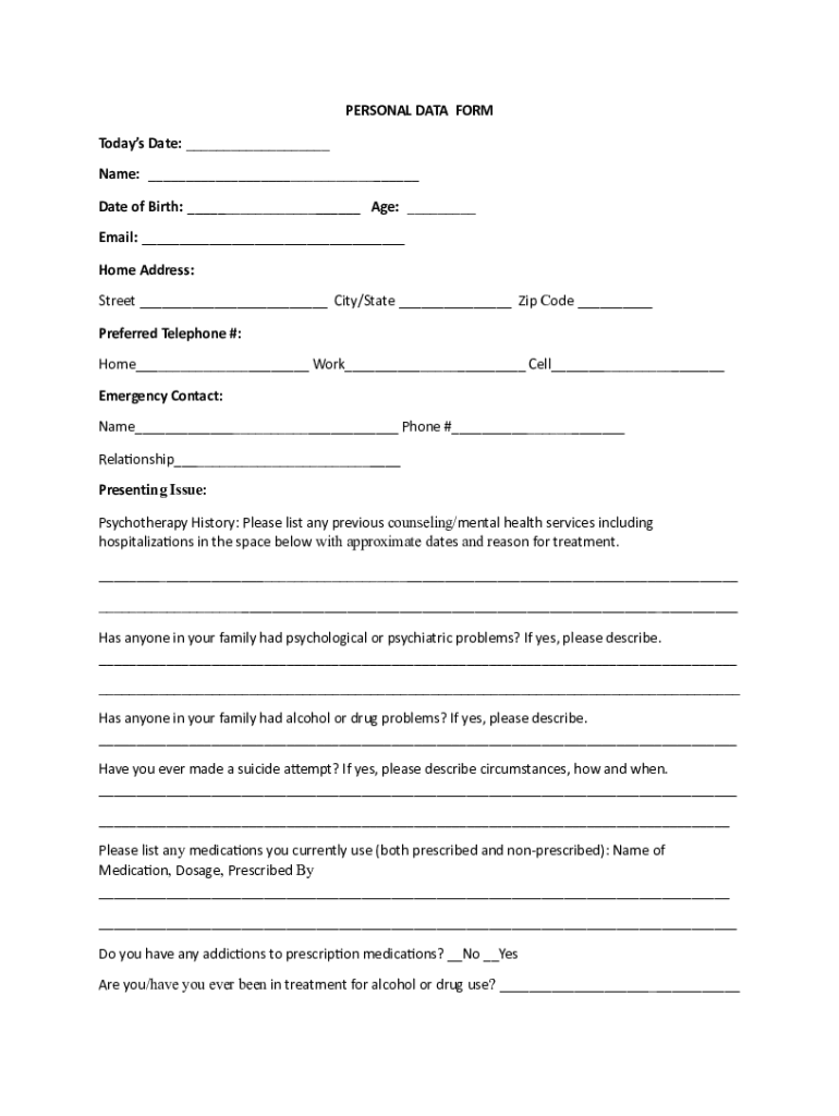 PERSONAL DATAFORMTodays Date: Name: Date of Birth: Age: Email: Home Address:Street City/State Zip Code Preferred Telephone #:Homework Cell Emergency Contact:Name Phone # Real;on ship Presenting Issue:Psychotherapy