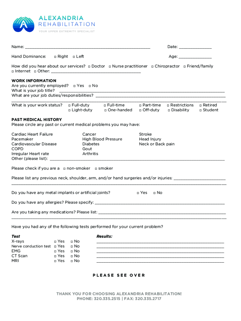 Name: Hand Dominance: Nightmare: Leakage: How did you hear about our services? Doctor Nurse practitioner Chiropractor Friend/family Internet Other: WORK INFORMATION Are you currently employed? Yes