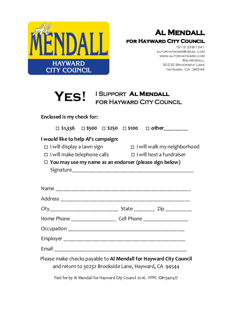 Al Kendall for Hayward City Council (510) 2581341 alforhayward gmail.com www.alforhayward.com Allendale 30232 Brookside Lane Hayward, CA 94544Yes! I Support Al Kendall for Hayward City CouncilEnclosed