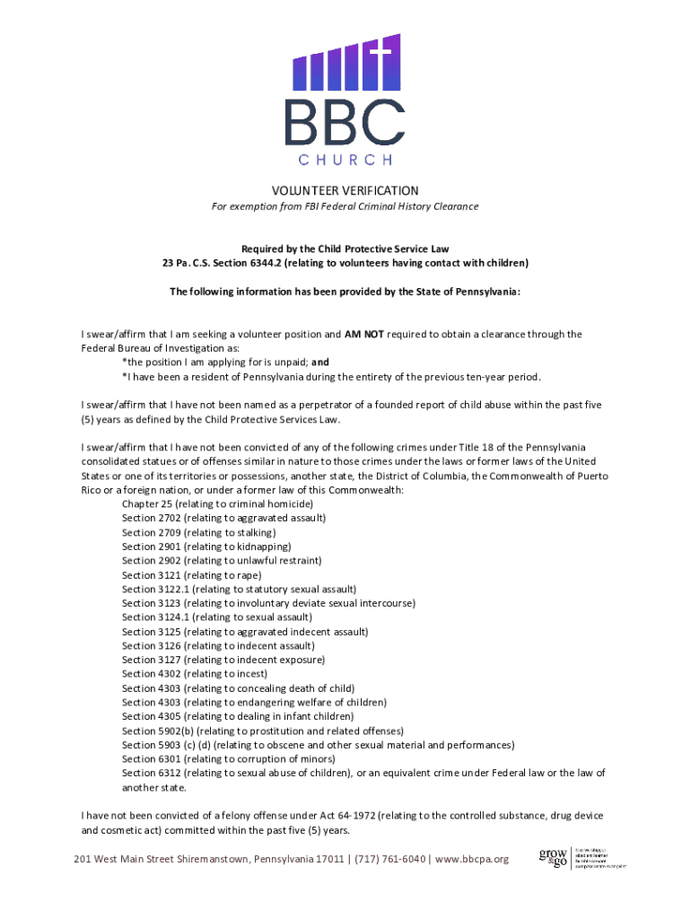 Get the free AFFIDAVIT Volunteer Verification for exemption from FBI ...