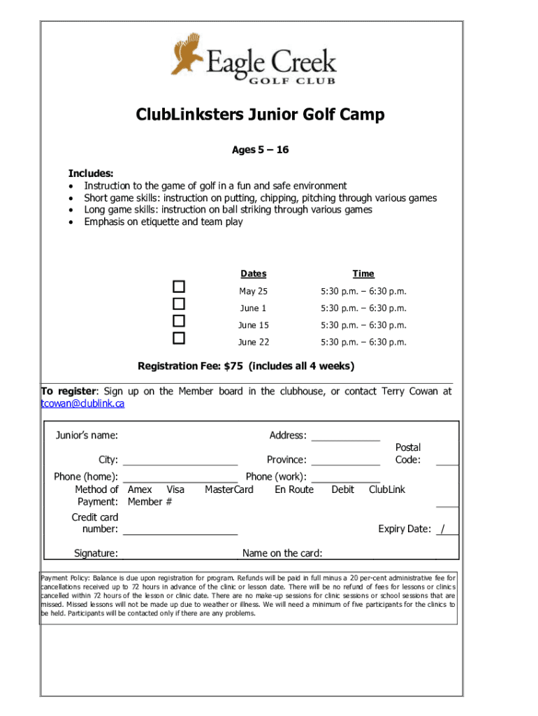 ClubLinksters Junior Golf Camp Ages 5 16 Includes: Instruction to the game of golf in a fun and safe environment Short game skills: instruction on putting, chipping, pitching through various games