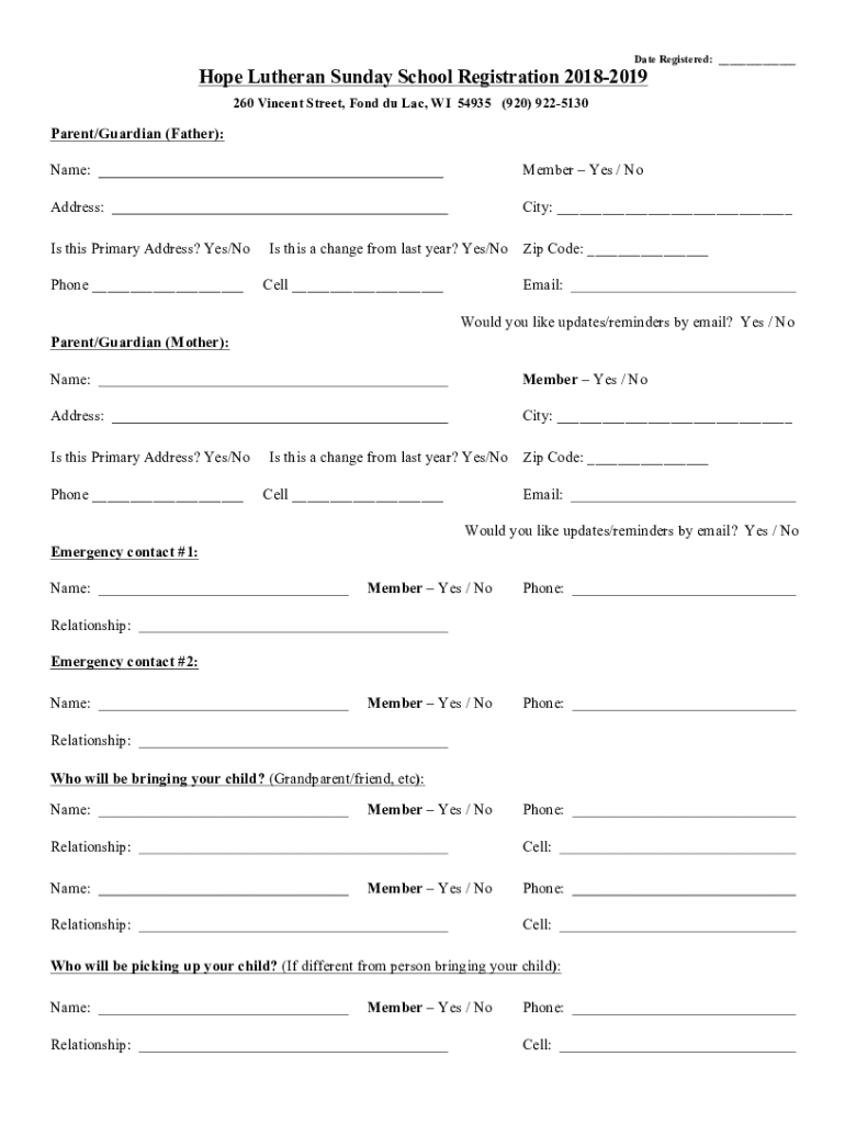 Date Registered: Hope Lutheran Sunday School Registration 20182019 260 Vincent Street, Fond du Lac, WI 54935 (920) 9225130Parent/Guardian (Father): Name:Member Yes / Address:City: Is this Primary