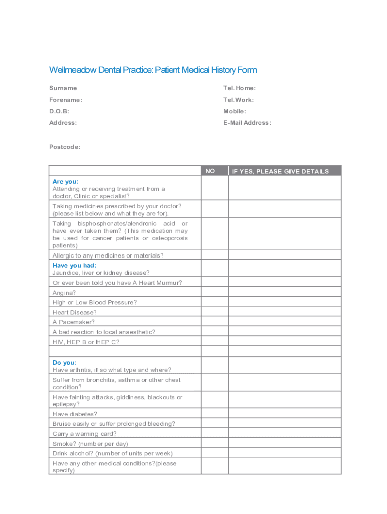 Get the free Wellmeadow Dental Practice: Patient Medical History Form