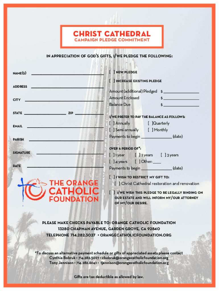 Christ cathedral campaign pledge commitment in appreciation of gods gifts, i/we pledge the following: name(s) new pledge increase existing pledge address city state zip email parish signature date