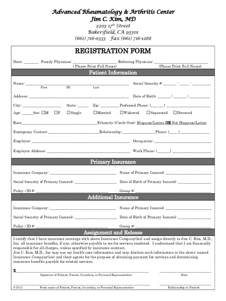 Advanced Rheumatology & Arthritis Center Jim C. Kim, MD 2203 17th Street Bakersfield, CA 93301 (661) 7160333 Fax (661) 7161288REGISTRATION FORM Date: Family Physician: Referring Physician: (Please