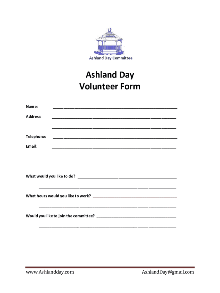 Ashland Day CommitteeAshland Day Volunteer Form Name: Address: Telephone: Email: What would you like to do? What hours would you like to work? Would you like to join the committee? www.Ashlandday.comAshlandDay