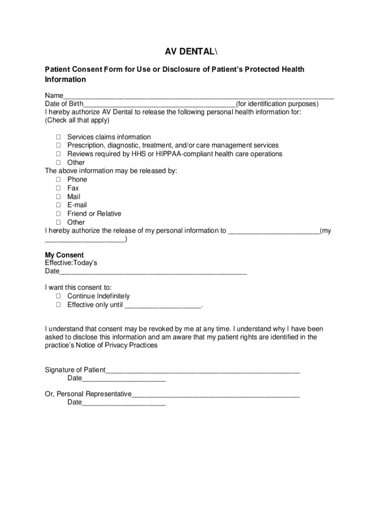 AV DENTAL Patient Consent Form for Use or Disclosure of Patients Protected Health Information Name Date of Birth (for identification purposes) I hereby authorize AV Dental to release the following