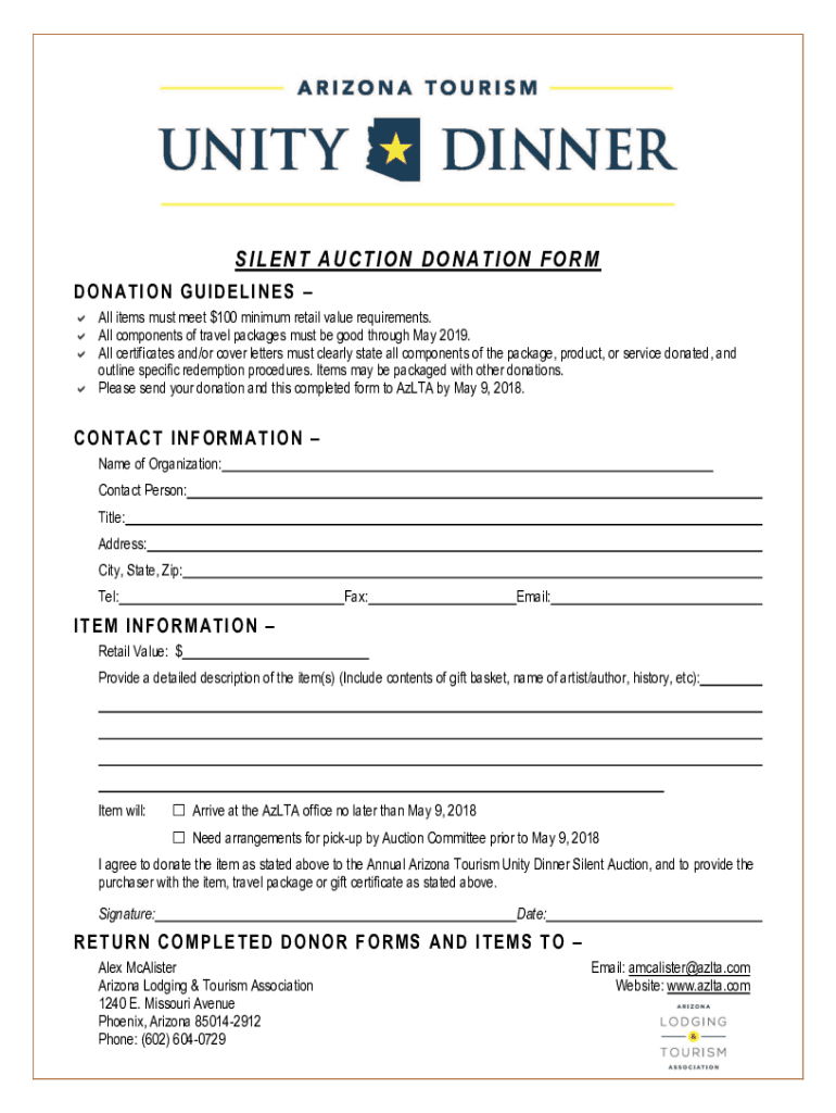 SILENT ACT ION DONATE ION FORM D O N AT I O N G UI D E L I NE S All items must meet $100 minimum retail value requirements. All components of travel package must be good through May 2019. All certificates