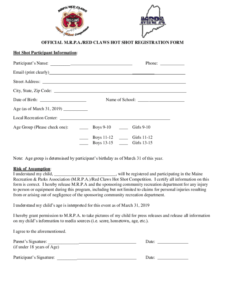 OFFICIAL M.R.P.A./RED CLAWS HOT SHOT REGISTRATION FORM Hot Shot Participant Information: Participants Name: Email (print clearly)Phone: Street Address: City, State, Zip Code: Date of Birth: Name of