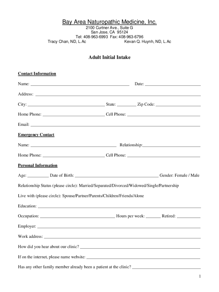 Bay Area Naturopathic Medicine, Inc. 2100 Curter Ave., Suite G San Jose, CA 95124 Tel: 4089636993 Fax: 4089636796 Tracy Chan, ND, L. Ac Kevin Q. Hugh, ND, L. Adult Initial Intake Contact Information