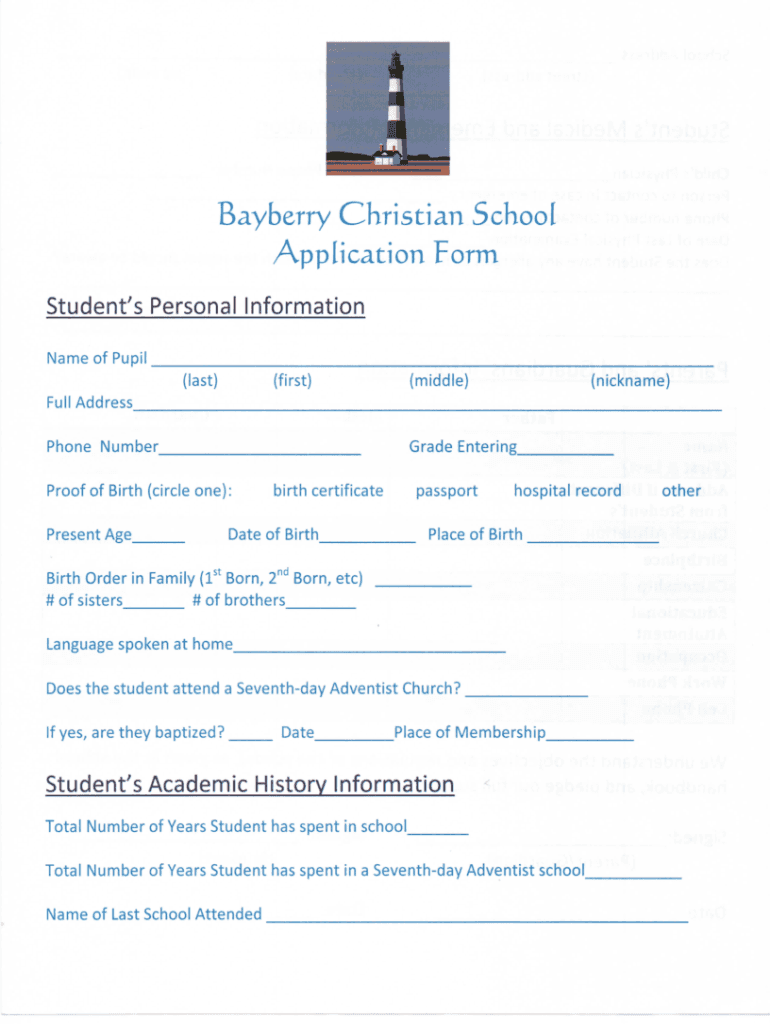 The Bayberry Christian School application is a form that prospective students and their families must complete to apply for admission to the school.