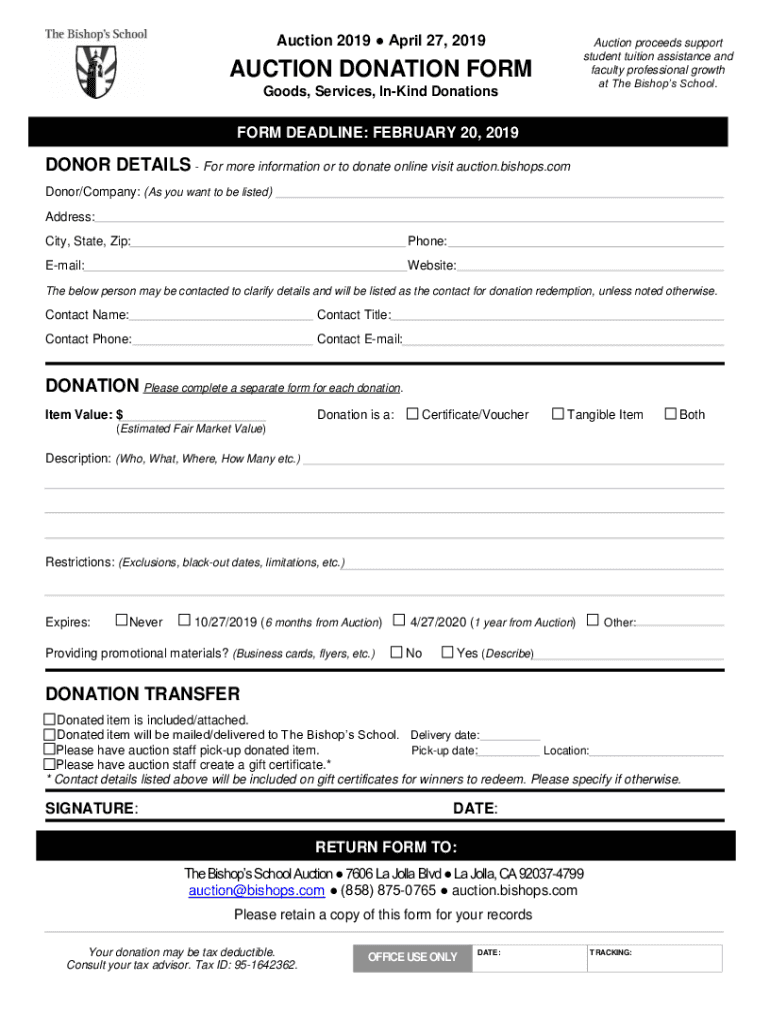 Auction 2019 April 27, 2019Auction proceeds support student tuition assistance and faculty professional growth at The Bishops School. AUCTION DONATION FORM Goods, Services, Inking DonationsFORM DEADLINE: