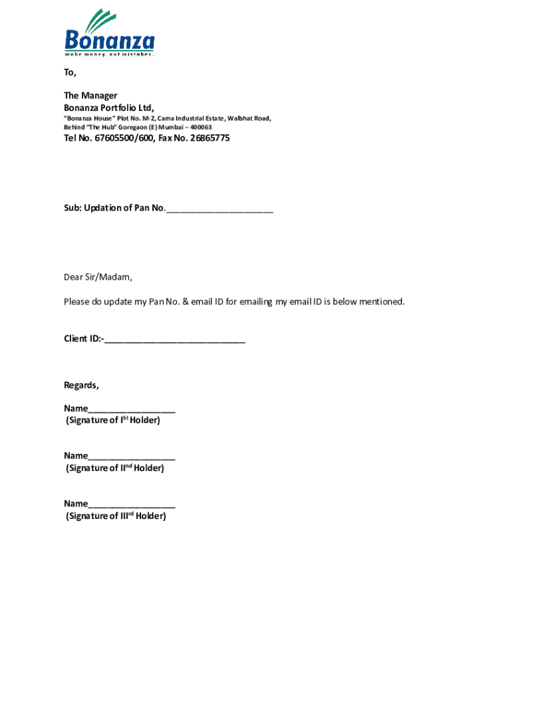 To, The Manager Bonanza Portfolio Ltd, Bonanza House Plot No. M2, Came Industrial Estate, Waldheim Road, Behind The Hub Oregon (E) Mumbai 400063Tel No. 67605500/600, Fax No. 26865775Sub: Update of