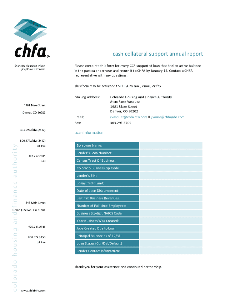 Cash collateral support annual report Please complete this form for every CCS supported loan that had an active balance in the past calendar year and return it to CFA by January 15. Contact a CFA