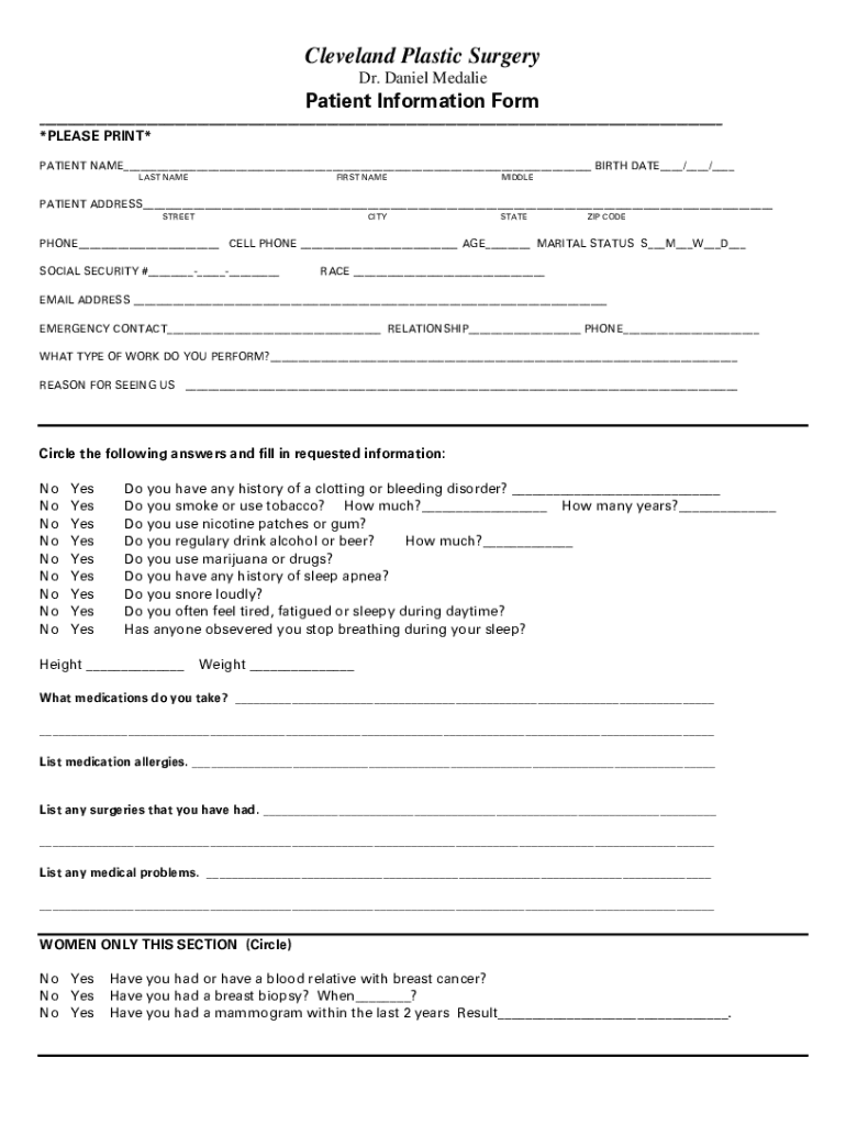 Cleveland Plastic Surgery Dr. Daniel MedaliePatient Information Form *PLEASE PRINT* PATIENT NAME BIRTH DATE / / LAST NAMEFIRST NAMEMIDDLEPATIENT ADDRESS STREETCITYSTATEZIP TELEPHONE CELL PHONE AGE